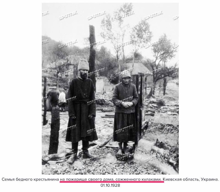 Но позвольте, во всех источниках (включая англоязычные) это фото подписано иначе: “Семья бедняка У СОЖЖЁННОГО КУЛАКАМИ дома (Киевский округ, 1928 г.)”. Правда, существенная разница?