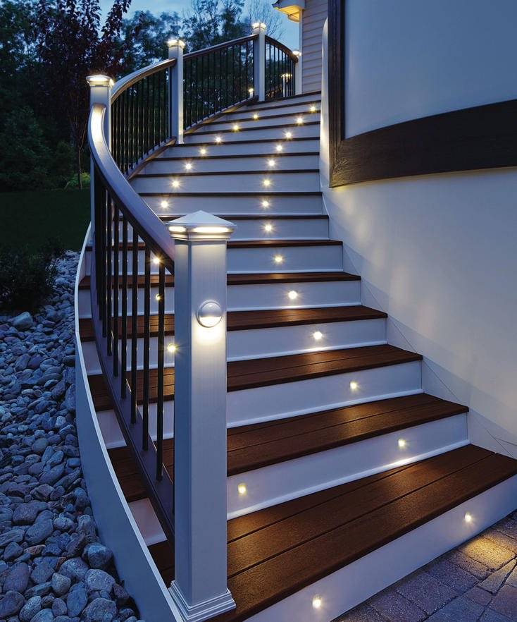 Напольные светильники на пути к двери показывают, куда идти. Таким образом, ступеньки в темноте не становятся опасностью для прохождения, так как уже есть места со встроенными точками, которые служат ориентиром без бликов. Подходящими для более длинных лестниц являются настенные встраиваемые прожекторы, которые освещают всю лестницу.