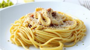 4. Обжарьте гуанчиале до хрустящей корочки, добавьте к спагетти, перемешайте.